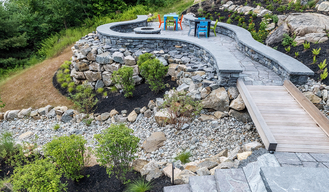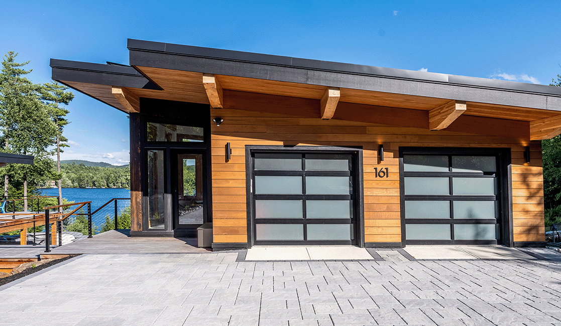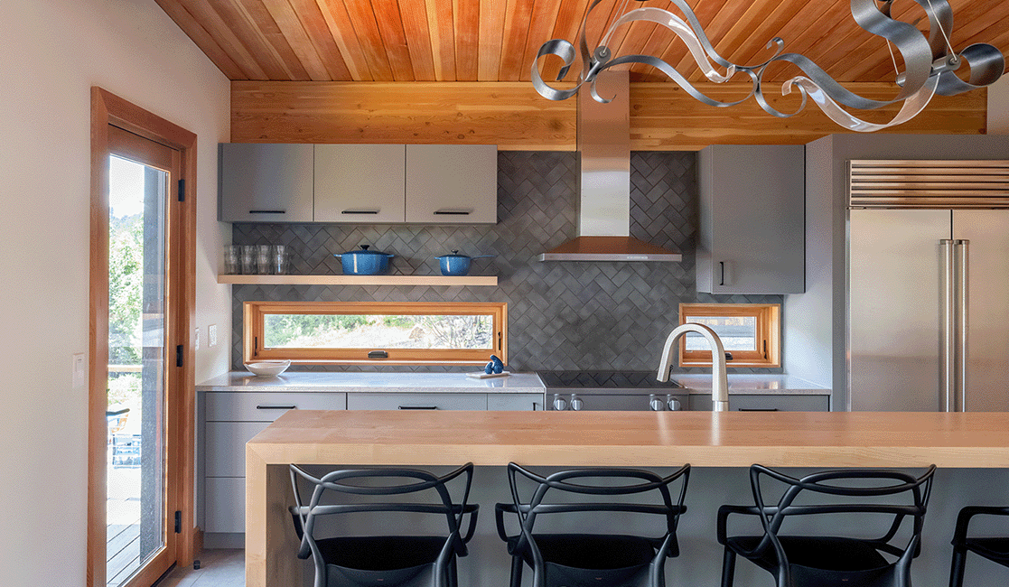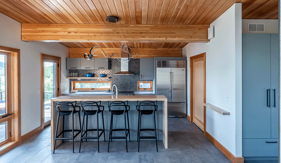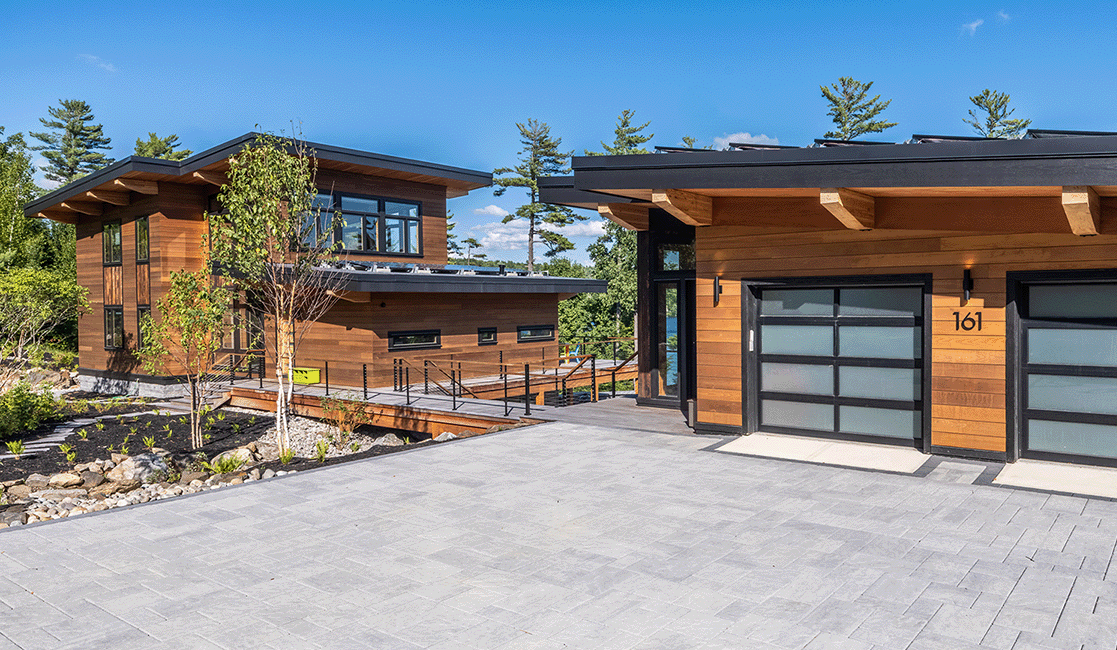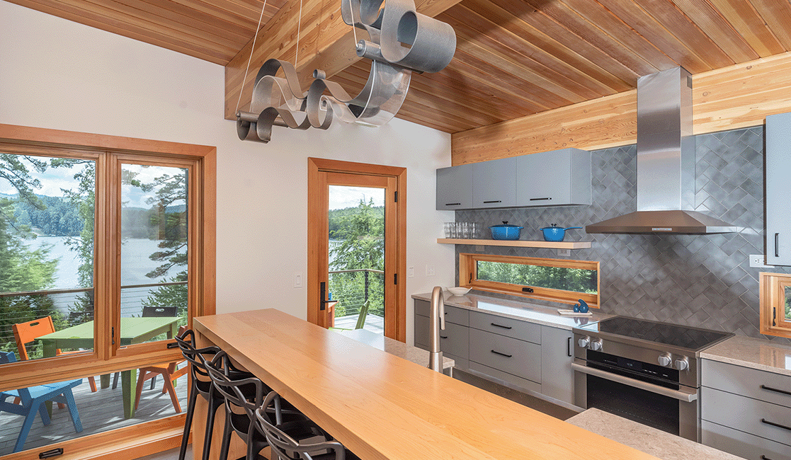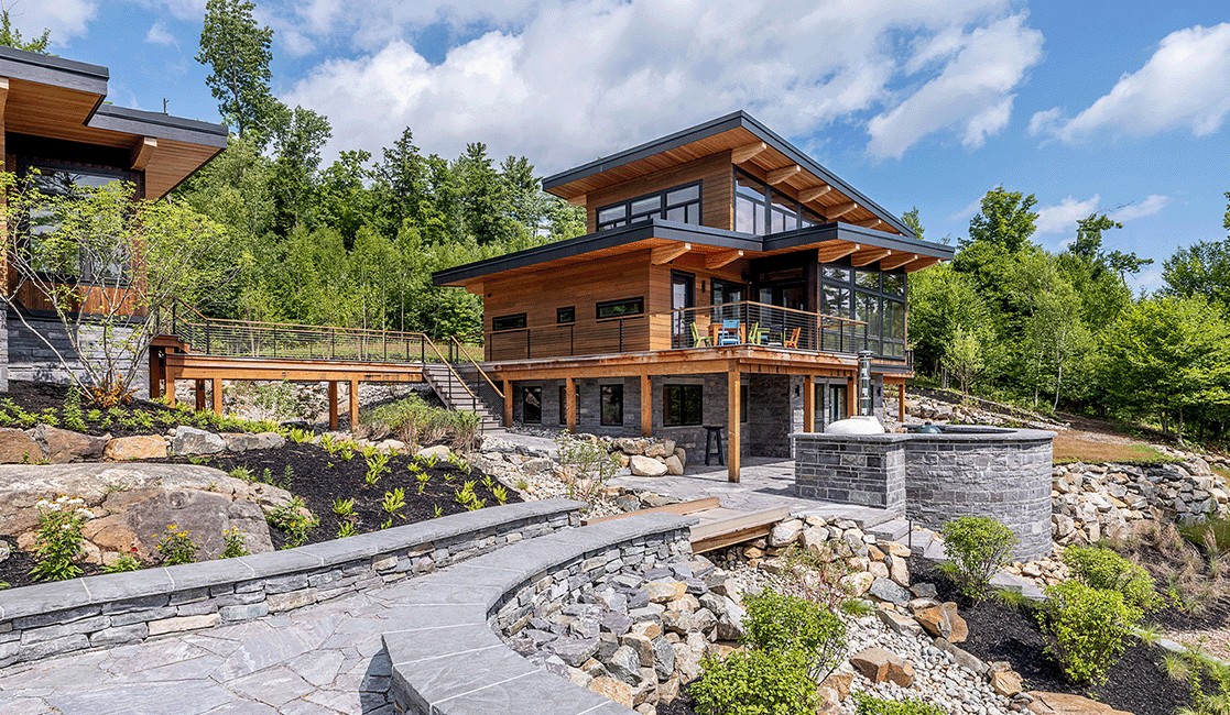 The house showcases a unique exterior with intersecting shed roofs supported by Douglas Fir glulam beams and insulated roofing panels. Expansive windows facilitate natural lighting and passive cooling. The siding uses Shou Sugi Ban, a traditional Japanese charred wood technique, melding with stained cedar and black metal elements. The landscape incorporates terraced walls constructed with granite unearthed during excavation.