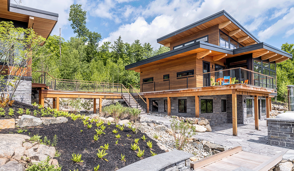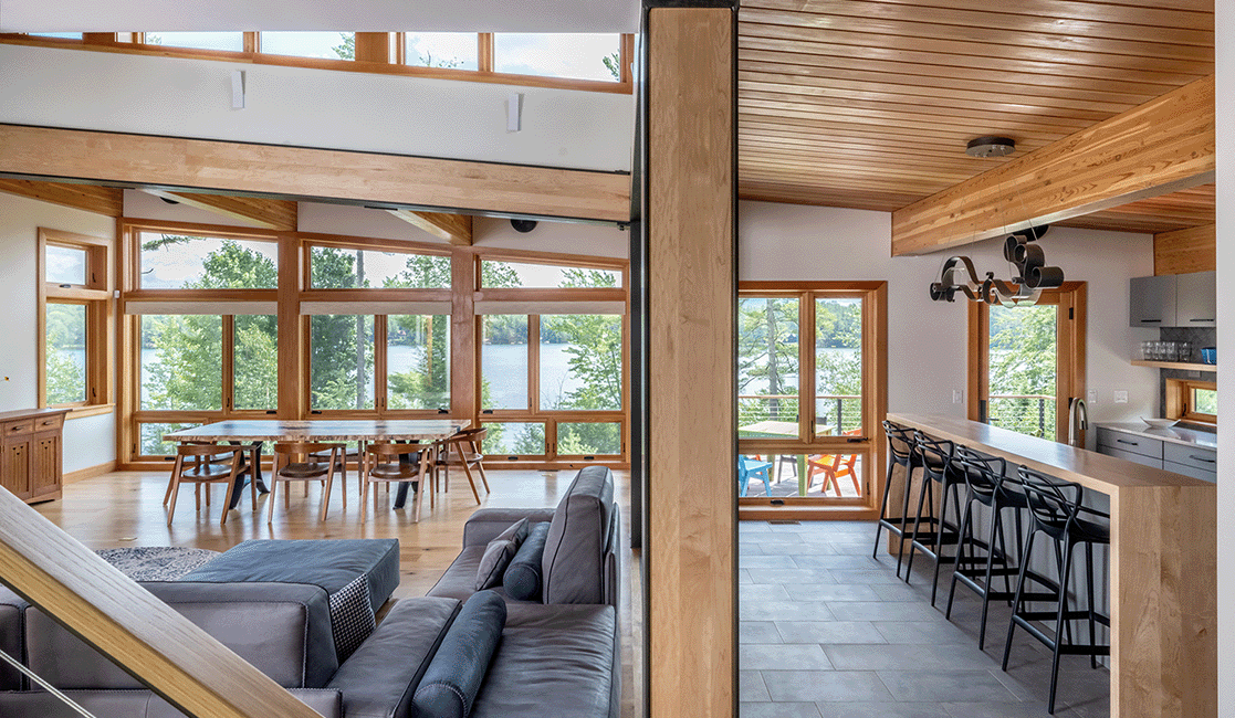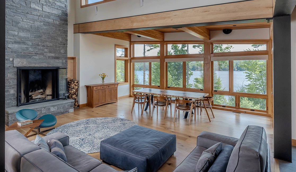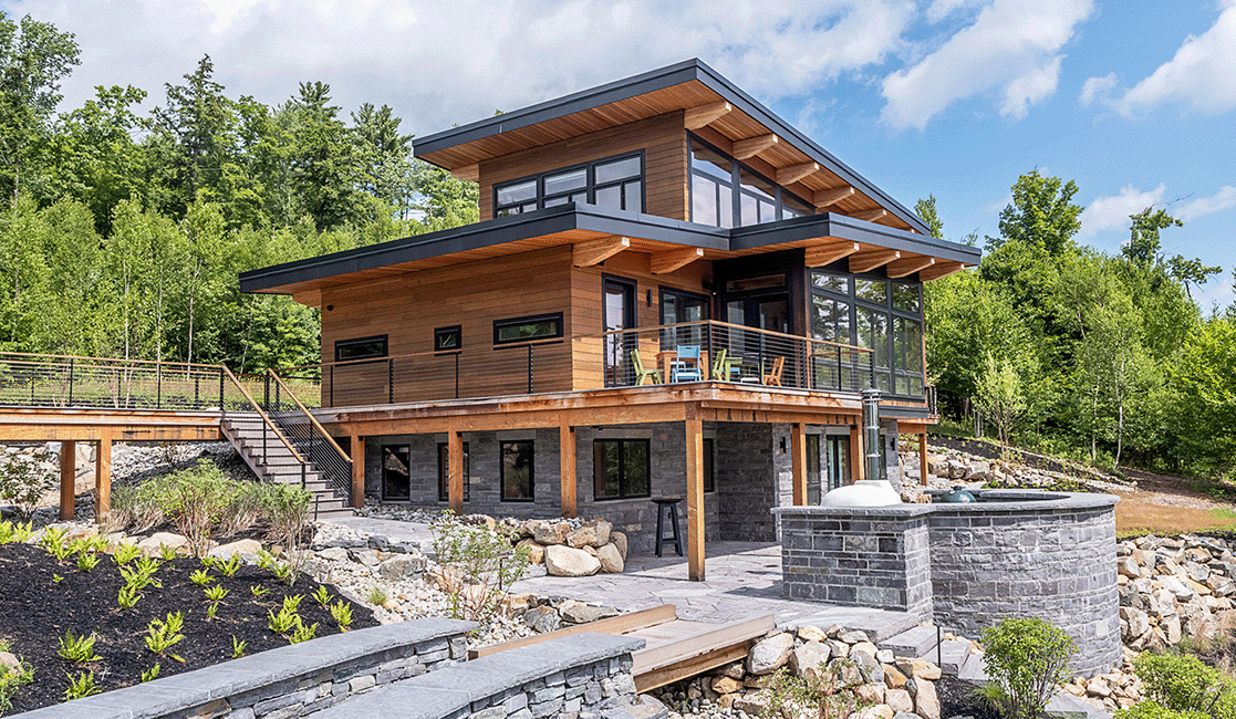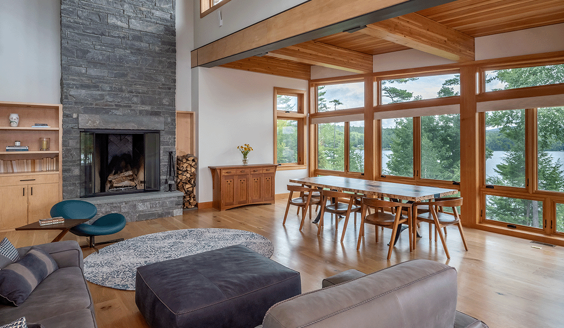 Nestled in the Adirondack region, this eco-friendly residence harmoniously blends with its natural setting through a fusion of contemporary and traditional wooden architecture. By embracing local materials and advanced energy-efficient features such as superior insulation, high-performance windows, and solar panels, this home achieves near-off-grid living with zero reliance on fossil fuels.